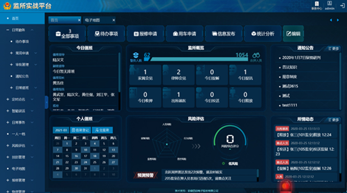 监所实战平台以监所实战营业为导向,,,,,,,以物联网、大数据为手段,,,,,,,升级、完善、整合安防系统和被羁系职员信息系统,,,,,,,实现监所技防治理、动态信息主导勤务、危害评估、执法监视四大营业功效,,,,,,,旨在提高监所危害预警和突发事务处置惩罚能力,,,,,,,是监所实战治理的“大脑中枢”。。。。。